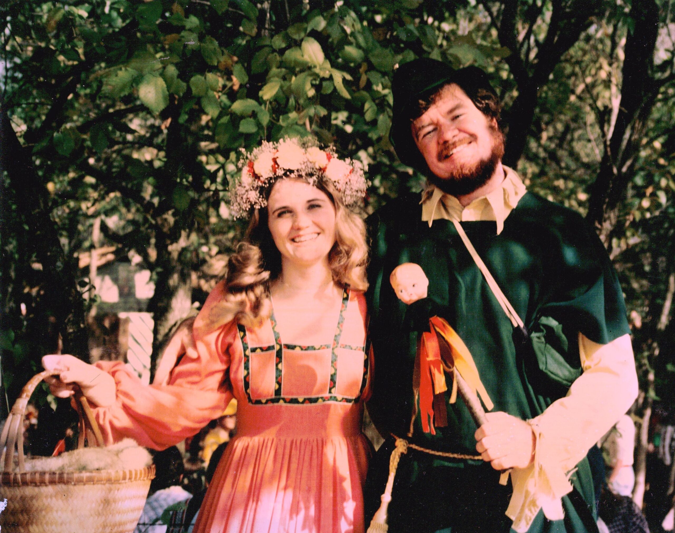 Their first date, a hunt for Frank’s Renaissance Festival costume at thrift stores, became the start of their life together. Frank creatively assembled a jester outfit complete with gold-dyed long underwear and bell-adorned booties, just one of many creative and ingenious projects he would eventually complete for his career, hobbies, and volunteer ventures. Lori wore a Gunny Sak dress.